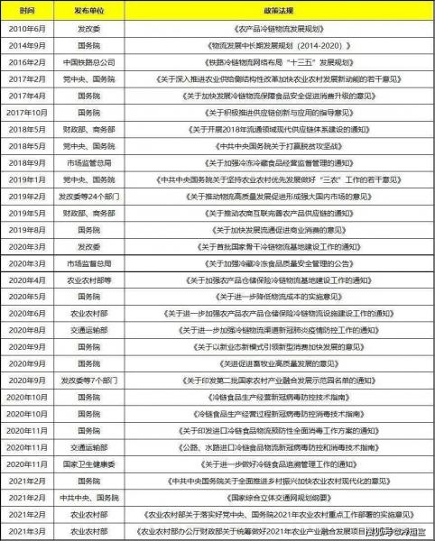 截止2021年3月,國家相關部門發布的一系列有關冷鏈物流行業發展的政策法規,主要聚焦在冷鏈物流基礎設施建設、冷鏈物流體系建設、促進農產品流通等方面,極大地促進了國內冷鏈物流行業發展,新規新標準將快速催生行業迭代,為行業的快速良性發展保駕護航。
