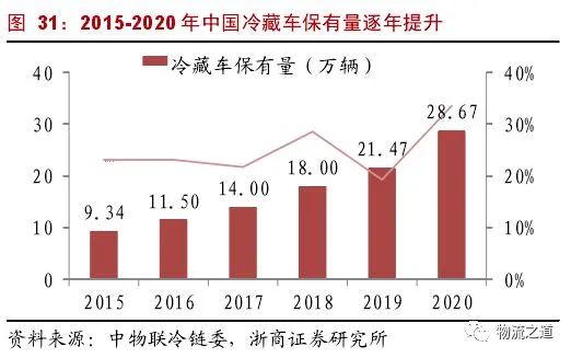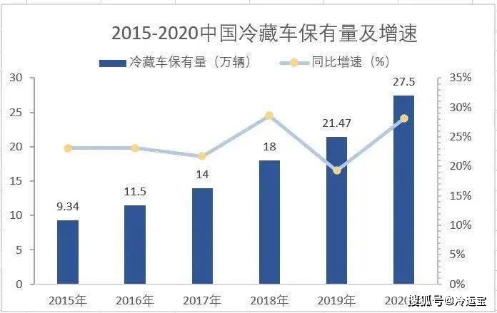 至2020年中國冷庫總量約為6665萬噸,同比增長10.11%。自2020年3月發改委發布的《關于首批國家骨干冷鏈物流基地建設工作的通知》,冷庫建設政策利好明顯,冷鏈市場迎來風口紅利,行業內一片景氣。預計到2021年及未來冷庫的總量仍將保持喜人的增勢,增速預計將超過15%。冷藏車作為冷鏈物流運輸的重要工具,近年市場保有量也一直逐年攀升,根據中物聯冷鏈委數據,2020年我國冷藏車市場保有量達到27.5萬輛,比2019年的21.47萬輛增長28.1%。2020年市場保有量及同比增量均刷新歷史記錄。