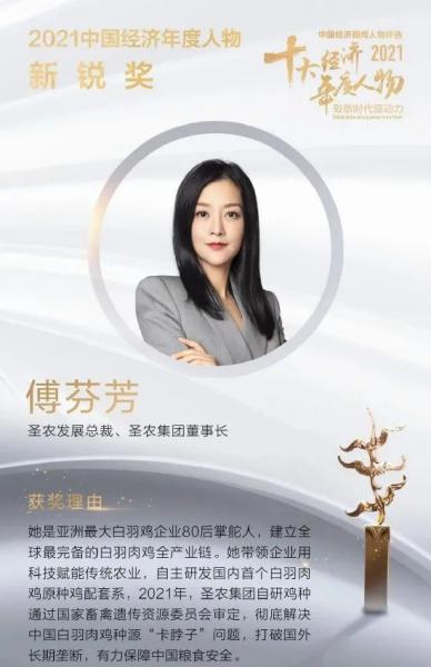 被譽為中國經濟奧斯卡大獎、“中國夢杯?中國經濟新聞人物——2021十大經濟年度人物”頒獎盛典于2022年1月11日在北京正大中心4層正式舉辦。圣農發展總裁、圣農集團董事長傅芬芳榮獲“2021中國經濟年度新銳獎”。