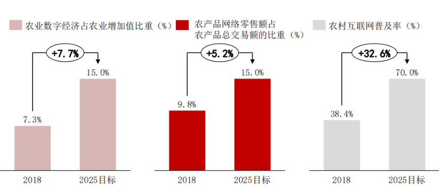 國家針對農(nóng)業(yè)數(shù)字化發(fā)展制定了目標與時間線,農(nóng)業(yè)數(shù)字化的發(fā)展前景明確。《數(shù)字農(nóng)業(yè)農(nóng)村發(fā)展規(guī)劃(2019-2025年)》,對農(nóng)業(yè)數(shù)字經(jīng)濟、農(nóng)產(chǎn)品網(wǎng)絡零售、農(nóng)村互聯(lián)網(wǎng)普三項工作的發(fā)展提出2025年指標。