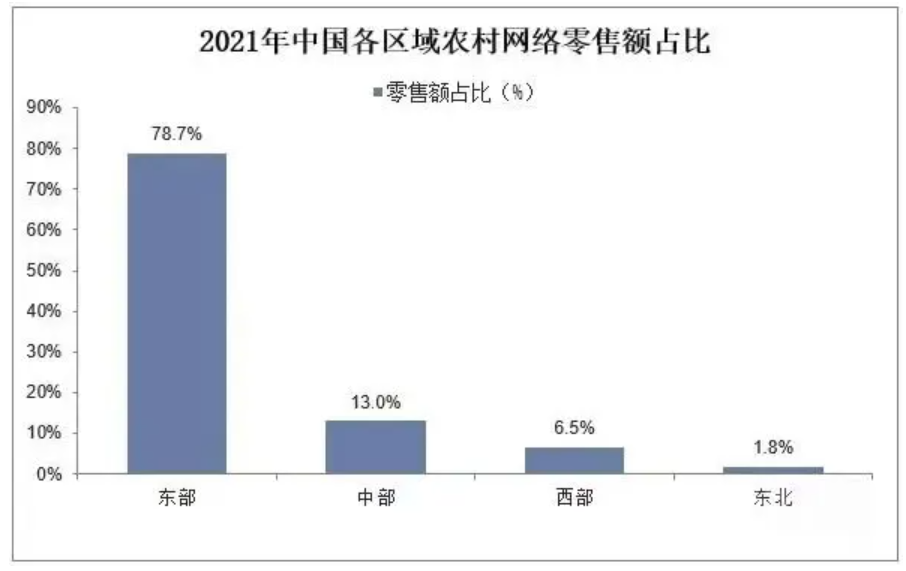 分地區(qū)看,東部、中部、西部和東北地區(qū)農(nóng)村網(wǎng)絡(luò)零售額分別占全國農(nóng)村網(wǎng)絡(luò)零售額的78.7%、13.0%、6.5%和 1.8%。