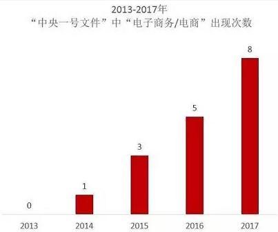 在2017年的“一號文件”中,“電子商務(wù)”(含“電商”)共出現(xiàn)8次,2014、2015、2016年出現(xiàn)的次數(shù)分別是1、3、5次,而在2013年未出現(xiàn)。