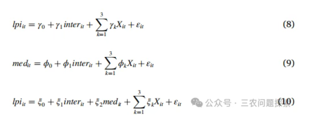 在第三節中,我們從收入增加、人力資本、物流發展以及產業融合這四個方面分析了互聯網發展是否影響LPI(某具體指標或指數,此處保留英文)。為檢驗互聯網能否通過農民收入、人力資本、物流發展以及產業融合這四個途徑來提升省級LPI,依據Wu等人(2021)的研究,構建中介效應模型如下: