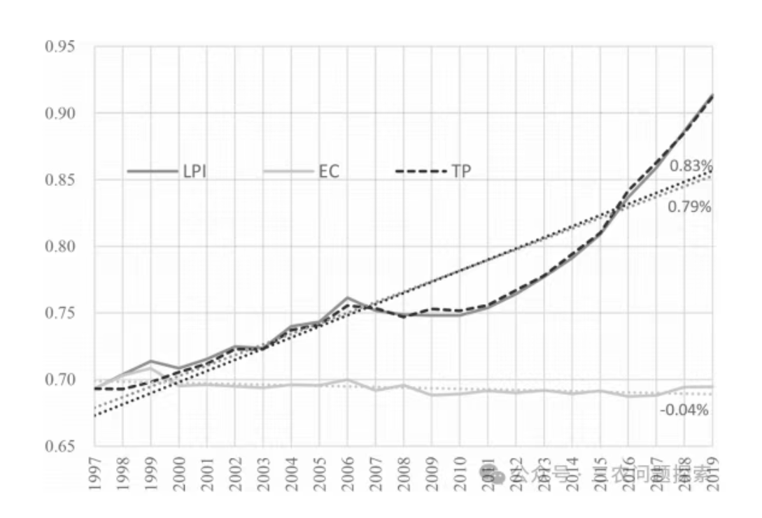 首先,在過去二十年中,中國的LPI(某具體指標或指數,此處保留英文)經歷了“快速-放緩-快速”的增長過程。總體而言,與過去相比,LPI有了更大程度的提升。此外,分解后的結果表明,技術進步(TP)是LPI增長的主要來源,而效率變化(EC)甚至產生了負面影響。