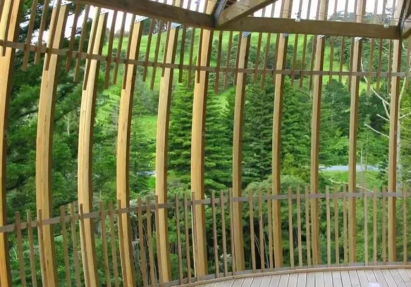縱向弧形的片狀結構,由 64 條環保的松木板制成。橫向則用楊木做連接。這種縱橫交錯、疏密有致的圓形墻體給人以安全感。