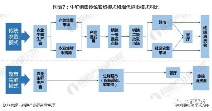 傳統農貿模式的流通環節過于繁復,而超市生鮮銷售模式具有直采直營、流通環節少、保證生鮮產品質量和安全等諸多優點,能從規?;少彙⑦\輸設備、冷藏設備等領域提升產業鏈效率。