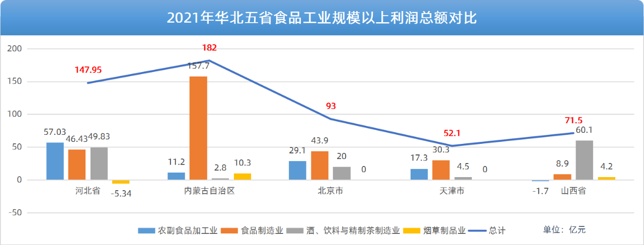 綜合比較企業數量、營業收入、利潤總額三個指標,河北省企業數量與營業收入均處于絕對領先位置,但利潤總額不及內蒙古自治區。主要由于河北農副食品制造業比重大,食品制造業比重較小,以及多年煙草制品業處于負利狀態。