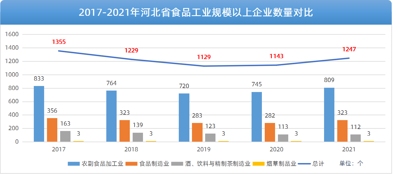 2017-2021年河北省食品工業規模以上企業數量呈現先遞減再遞增趨勢。分析內部結構可知,酒、飲料與精制茶制造業一直處于遞減狀態。農副食品加工業先減后增,食品制造業近兩年進入復蘇階段,增長潛力較大。