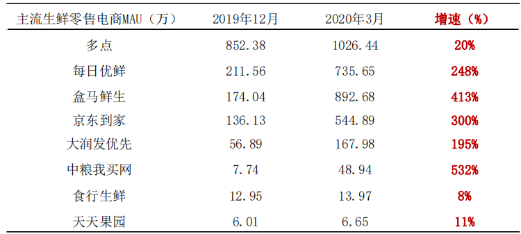 疫情爆發(fā)期間,主流生鮮零售電商MAU實現(xiàn)超高速增長,農(nóng)產(chǎn)品上行加速。疫情期間,居民因居家隔離等原因,線上購買生鮮農(nóng)產(chǎn)品的需求大大增加,2020年Q1,很多生鮮電商平臺MAU實現(xiàn)數(shù)倍增長。2020年全年,生鮮零售線上比例為14.6%,比2019年增加近6pct。農(nóng)產(chǎn)品上行速度加快,糧油、肉禽蛋、奶類、蔬菜和豆制品五類農(nóng)產(chǎn)品網(wǎng)絡(luò)零售額同比增速均超過30%,遠高于全國網(wǎng)上零售額增速10.9%。