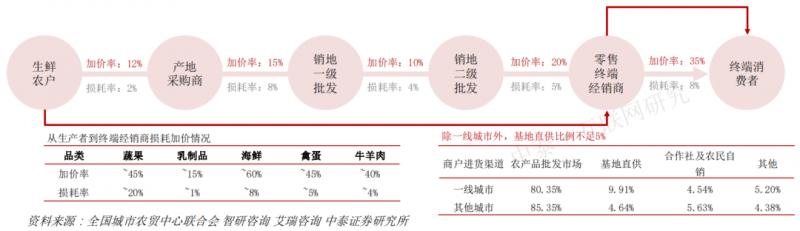 層層周轉(zhuǎn)導(dǎo)致層層加價和損耗。根據(jù)艾瑞咨詢的數(shù)據(jù),我國主要生鮮總加價率在100%以上,不易儲存的蔬果損耗最為嚴重,損耗率達20%以上。