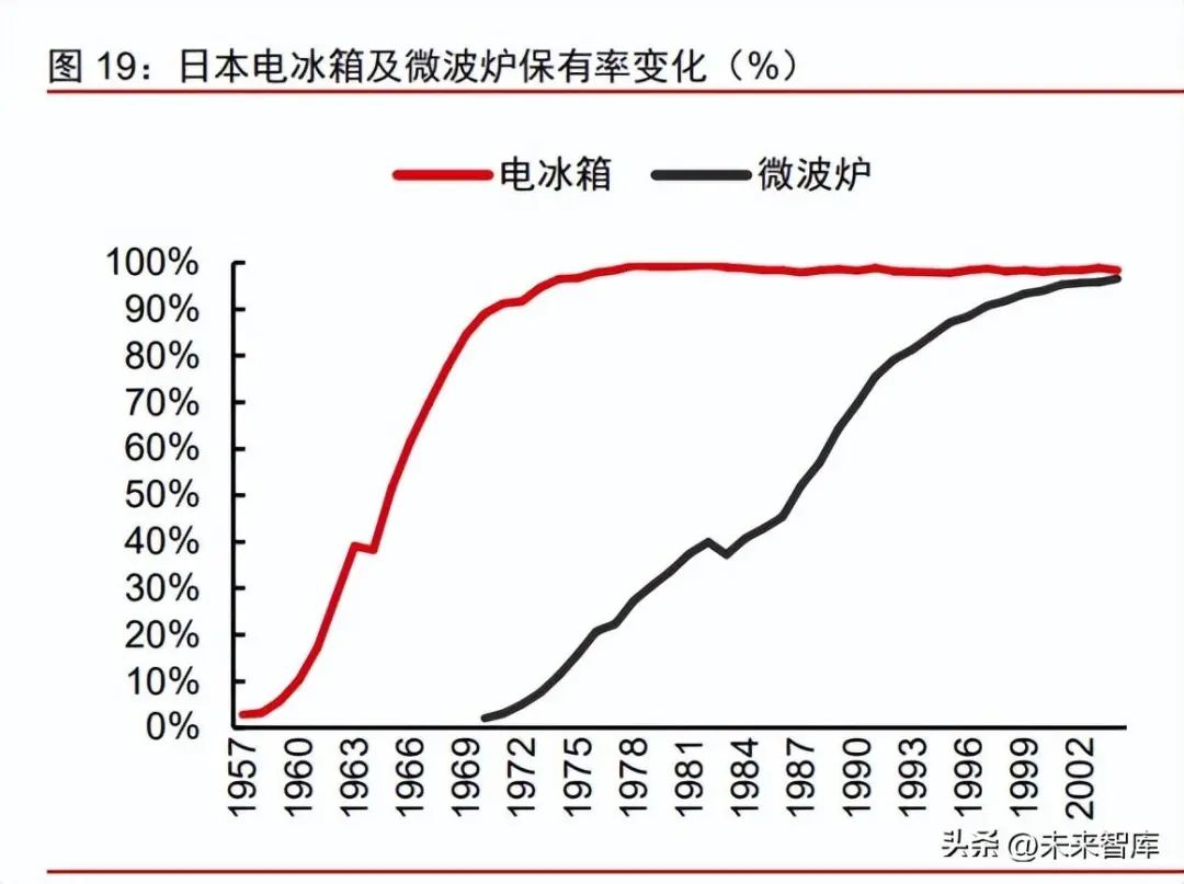 女性勞動(dòng)參與率上升提升便捷化烹飪需求,電冰箱及微波爐普及驅(qū)動(dòng)家庭端滲透, 1971-1997 年家庭端冷凍食品銷量 CAGR 約 7%。隨著日本經(jīng)濟(jì)快速發(fā)展,日本女性勞動(dòng) 參與率逐步提高,家庭端對便捷化烹飪需求亦日益提升。雖然 1971 年日本電冰箱保有率 已超過 90%,但微波爐保有率僅為 3%,而且早期具有操作不便、價(jià)格較高的特點(diǎn),限制 了部分消費(fèi)者對冷凍食品的使用。隨著微波爐產(chǎn)量增加和售價(jià)下降,微波爐保有率在 1997 年已超過 90%,至此冷凍食品保存和烹飪的設(shè)備均已實(shí)現(xiàn)普及,日冷、味之素等龍頭企業(yè) 在此期間也相繼推出適用于微波爐的產(chǎn)品,消費(fèi)者可使用微波爐直接加熱帶包裝的煮食和 西洋料理等冷凍食品,而之前手工制作通常需要一小時(shí)以上時(shí)間。我們測算 1997 年日本 家庭端冷凍食品消費(fèi)量約為 1971 年 6 倍,1971-1997 年期間銷量 CAGR 約 7%。