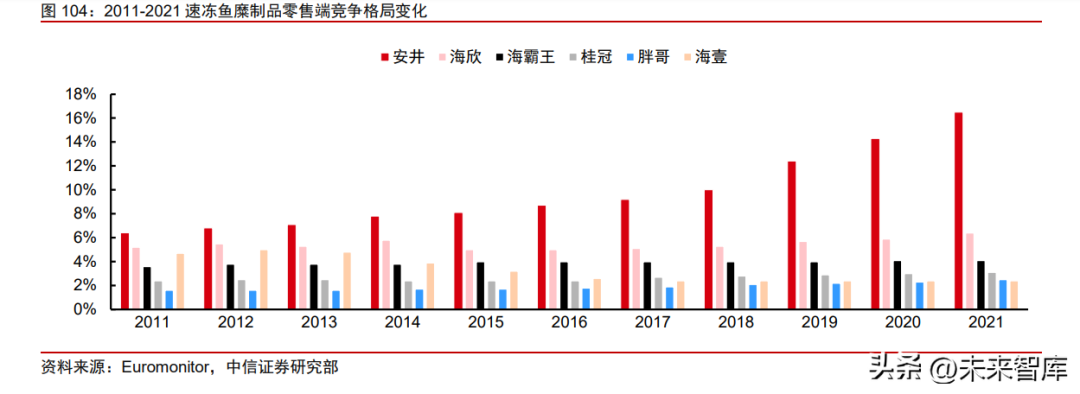 速凍米面及速凍火鍋料集中度相對較高,但狹義預(yù)制菜仍然高度分散。分品類看,速 凍米面作為發(fā)展最早的品類,加之其產(chǎn)品也較為集中,目前集中度已處于較高水平,其中 湯圓、水餃、粽子的 CR3 已超過 60%,面點(diǎn)和休閑類相對較低,但 CR3 也在 50%左右。速凍火鍋料隨著安井等龍頭企業(yè)的全國化擴(kuò)張及產(chǎn)能釋放,集中度持續(xù)提升,以速凍魚糜 制品為例,零售端 CR3 從 2011 年 15%提升至 2021 年 27%,其中安井食品份額從 6.4% 提升至 16.5%。相比之下,狹義預(yù)制菜則普遍處于高度分散、有品類無品牌的狀態(tài)。