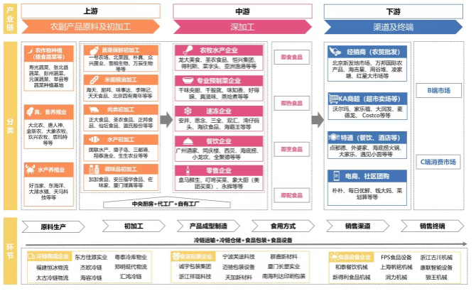 下游渠道及終端主要分為B、C端,B端包括經銷商(農貿批發)、餐飲酒店、商超、鄉廚等渠道,C 端主要面向個人,以電商渠道為主。另外,冷鏈物流、食品包裝、食品設備企業貫穿全產業鏈,是預制菜行業從生產端到消費端發展的基礎和支撐。