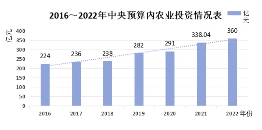 從“十三五”時期開始中央預算內投資農業建設項目的總規模呈現出快速增長和重點支持的態勢和特點。尤其從2018年機構改革以來,投資規模更是大幅增長,如2019年較2018年增加了44億元,增幅達到18.5%;而到了2021年,投資規模更是達到了338億元,比2020年增加了48億元,增幅為16.49%,到了2022年,投資規模仍在持續增長。根據相關政策文件和規劃,中央預算內投資在農業建設項目上的投入力度將持續加大。