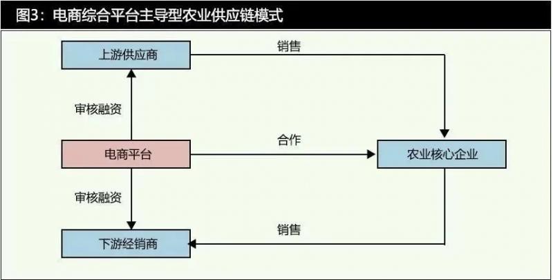 越來越多的電商平臺進入農村市場,電商平臺通過龐大的供應商資源、海量的交易數據資源及自建的物流網絡,成為集“信息流、物流和資金流”為一體的平臺,實則承擔傳統供應鏈金融中的核心企業功能。由此,電商平臺成為農業供應鏈金融的主體,通過平臺大數據對農業信息進行實時監控,利用平臺實現供應鏈內部的資金閉環流動。同時,電商平臺還引入擔保機構、保險公司等金融機構,提供更豐富的農業供應鏈金融產品。