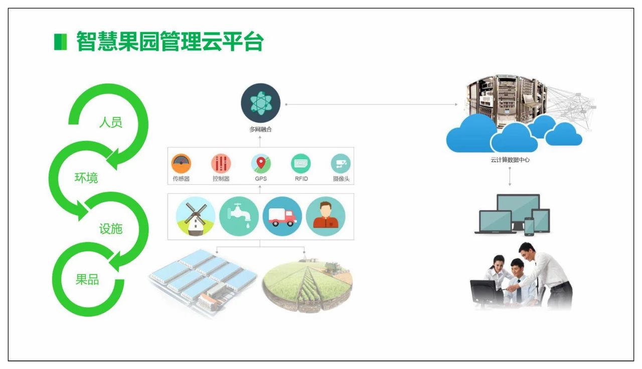 果園的智慧化應(yīng)用模式:四情監(jiān)測(cè)(墑情、苗情、蟲情、災(zāi)情);果園生產(chǎn)管理(智能化控制,農(nóng)業(yè)技術(shù)指導(dǎo));品牌經(jīng)營(yíng)(品牌網(wǎng)站,電商交易平臺(tái));生態(tài)休閑(果樹網(wǎng)上認(rèn)領(lǐng)/周末果園);果品溯源(加工環(huán)節(jié)、庫(kù)存環(huán)節(jié)、運(yùn)輸環(huán)節(jié)、零售環(huán)節(jié))。