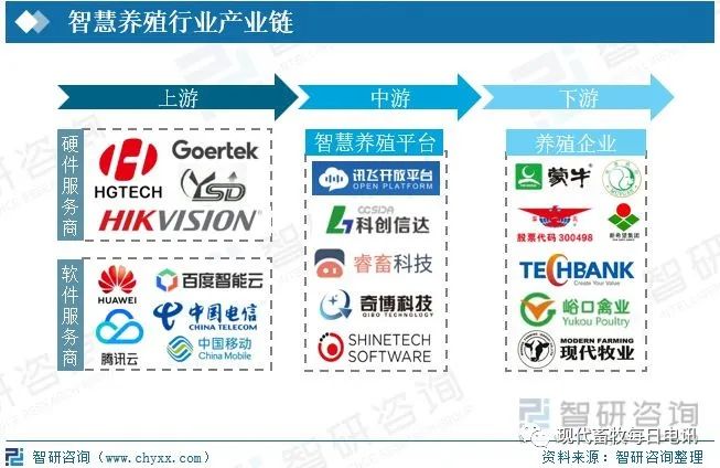 從產業鏈來看,上游主要可以分為自動投喂機、攝像頭、傳感器等硬件服務商及大數據、人工智能、云計算等軟件服務商,下游則為各生豬、牛、水產等養殖企業。
