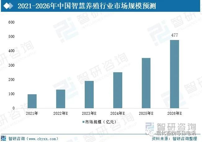智慧養殖作為智慧農業組成之一,建設仍處于初期階段,2021年市場規模為98億元左右,未來在政策鼓勵及技術不斷創新下,中國智慧養殖建設不斷加速,將有越來越多的養殖企業將新興技術運用到養殖中,預計到2026年行業市場規模將達477億元。