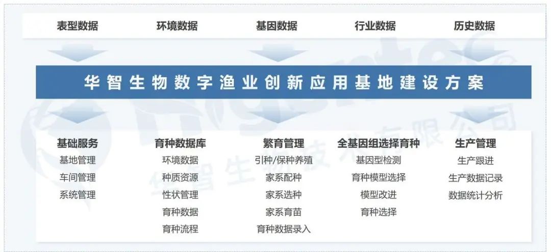 華智生物基于自身生物育種及農業大數據技術優勢,構建全鏈路數字漁業創新應用基地整體解決方案,旨在為漁業生產者提供標準化、數字化、智能化的綜合解決方案,達到降本增效的目的;為消費者提供有效的農產品生產質量監管依據;同時為漁業產業鏈上下游提供有價值的數據支撐服務。該數字漁業創新應用基地整體解決方案結合水產物聯網智能設備及全基因組選擇技術,實現從引種、育種到生產的全流程信息化、數字化、智能化管理,通過打造漁場生產經營數字化管理中樞,大幅提升漁業育種及生產效率,為推進我國漁業產業綠色健康發展,促進水產種業振興貢獻華智力量。