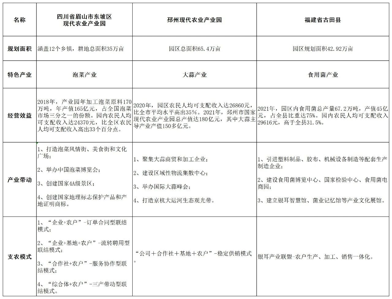 在國家政策的引導下,各級地方政府積極落實,部分依托地方特色產業的現代農業產業園已建成投產,在做大做強優勢產業、帶動農戶增收致富的同時,也為后續現代農業產業園的建設積累了寶貴經驗,本文梳理了三個成功的現代農業產業園以供借鑒,詳見下表:
