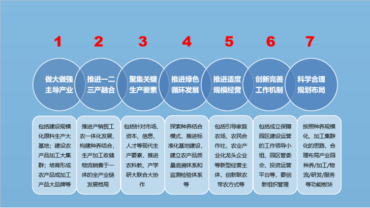 各地應(yīng)立足優(yōu)勢(shì)和資源稟賦,瞄準(zhǔn)農(nóng)業(yè)全產(chǎn)業(yè)鏈開(kāi)發(fā),明確發(fā)展主導(dǎo)產(chǎn)業(yè)和優(yōu)先順序,構(gòu)建以產(chǎn)業(yè)強(qiáng)鎮(zhèn)為基礎(chǔ)、產(chǎn)業(yè)園為引擎、產(chǎn)業(yè)集群為骨干、省縣鄉(xiāng)梯次布局、點(diǎn)線面協(xié)同推進(jìn)的現(xiàn)代鄉(xiāng)村產(chǎn)業(yè)體系,加快推動(dòng)品種培優(yōu)、品質(zhì)提升、品牌培育和標(biāo)準(zhǔn)化生產(chǎn),整體提升產(chǎn)業(yè)發(fā)展質(zhì)量效益和競(jìng)爭(zhēng)力。國(guó)家現(xiàn)代農(nóng)業(yè)產(chǎn)業(yè)園要立足縣域,以規(guī)模種養(yǎng)為基礎(chǔ),推進(jìn)“生產(chǎn)+加工+科技”一體化發(fā)展,集聚現(xiàn)代要素和經(jīng)營(yíng)主體,加快產(chǎn)業(yè)全環(huán)節(jié)升級(jí)全鏈條增值,全面推行綠色生產(chǎn)方式,創(chuàng)新科技集成和聯(lián)農(nóng)帶農(nóng)機(jī)制,著力打造引領(lǐng)帶動(dòng)鄉(xiāng)村產(chǎn)業(yè)振興的平臺(tái)載體和農(nóng)業(yè)現(xiàn)代化的“引擎”。優(yōu)勢(shì)特色產(chǎn)業(yè)集群要立足省域,聚焦一個(gè)優(yōu)勢(shì)特色品種并突出重點(diǎn)縣市,全產(chǎn)業(yè)鏈開(kāi)發(fā)、全價(jià)值鏈提升,推動(dòng)產(chǎn)業(yè)形態(tài)由“小特產(chǎn)”轉(zhuǎn)變?yōu)椤按螽a(chǎn)業(yè)”,空間布局由“平面分散”轉(zhuǎn)變?yōu)椤凹喊l(fā)展”,主體關(guān)系由“同質(zhì)競(jìng)爭(zhēng)”轉(zhuǎn)變?yōu)椤昂献鞴糙A”,打造具有較強(qiáng)綜合競(jìng)爭(zhēng)力的現(xiàn)代農(nóng)業(yè)產(chǎn)業(yè)經(jīng)濟(jì)帶。農(nóng)業(yè)產(chǎn)業(yè)強(qiáng)鎮(zhèn)要立足鄉(xiāng)鎮(zhèn),發(fā)揮鄉(xiāng)鎮(zhèn)上聯(lián)城市、下接鄉(xiāng)村的紐帶作用,聚焦一個(gè)農(nóng)業(yè)主導(dǎo)產(chǎn)業(yè),推動(dòng)產(chǎn)城融合、產(chǎn)村融合發(fā)展,打造綜合服務(wù)功能強(qiáng)、宜居宜業(yè)的鄉(xiāng)村產(chǎn)業(yè)融合綜合體。