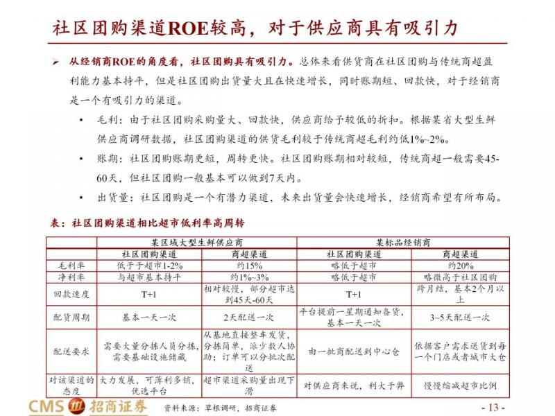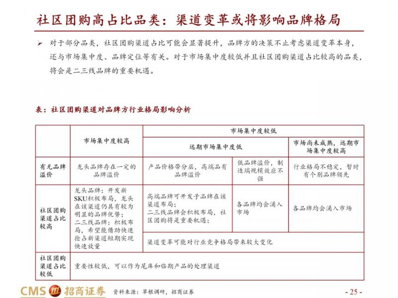 縱觀零售業的發展歷史,每一次大的渠道變革不僅是一場效率革命,還會深刻影響品牌方。社區團購長期市場規模超萬億,以高性價占領消費者心智,并可高效下沉至鎮村級市場,對于某些高頻+剛需+低品牌溢價的品類將會成為重要渠道,或將帶來上游品牌格局的變化。從投資角度看,二三線品牌產品更具性價比、原經銷渠道包袱往往較輕,有望借助社區團購迎來新的發展機遇,但起量后仍需重視品牌力的塑造與多渠道的運營能力,方能成為“時間的朋友”。