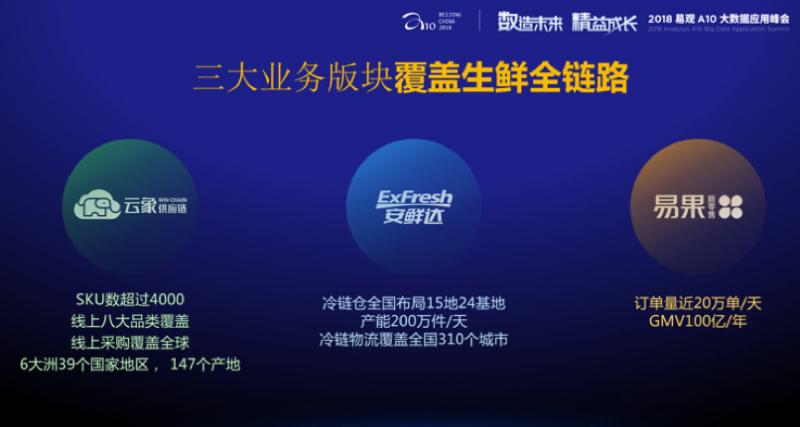 我們有三大體系,云象供應(yīng)鏈,在中國來說,特別在進(jìn)口生鮮方面一個最大供應(yīng)鏈公司,安鮮達(dá)是我們在全國已經(jīng)有最大的冷鏈物流配送企業(yè),我們也是菜鳥冷鏈唯一合作商,因為沒有一家可以像我們這樣布到全國的。易果剛才說了,在天貓超市買的所有生鮮都是易果在運營,箱子上寫的安鮮達(dá)。