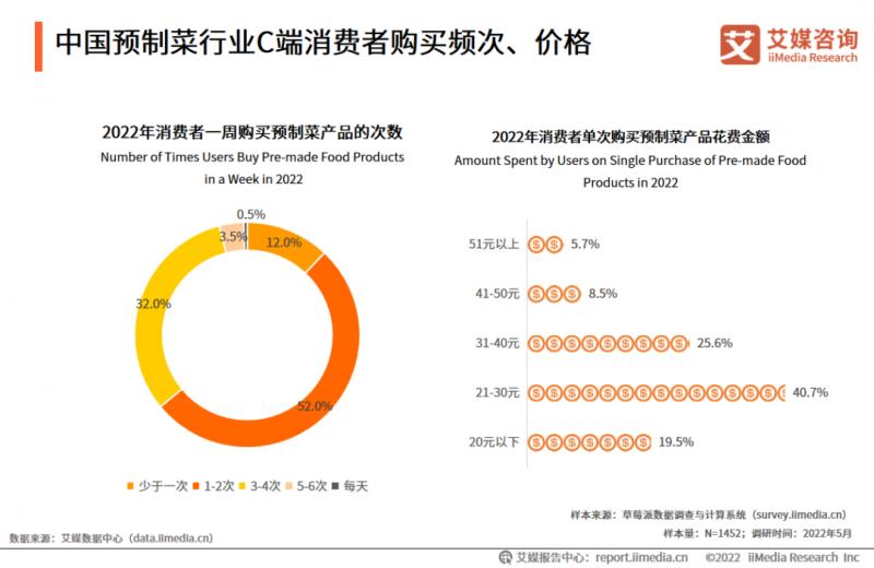 調(diào)研數(shù)據(jù)顯示,每周購買預制菜品1-2次的消費者占52.0%,每周都購買預制菜的消費者占比達88%。價格方面,消費者單次消費21-30元占比最多,其次是31-40元。