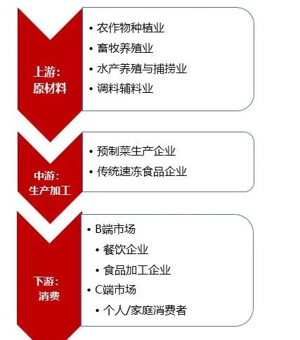 總體來看,按預(yù)制菜產(chǎn)業(yè)鏈從上至下的順序,可以分為:原材料、生產(chǎn)加工和消費(fèi)端。