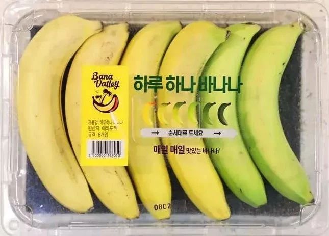 一般情況下,我們買香蕉都是一斤一斤,一把一把地買,但是,韓國的一家超市卻推出了“一天一香蕉”,一共6根香蕉的組合包裝。也就是把不同成熟度的香蕉,按照成熟的先后順序排列打包。這樣一來,顧客每天就可以依次吃到恰好轉熟的香蕉。