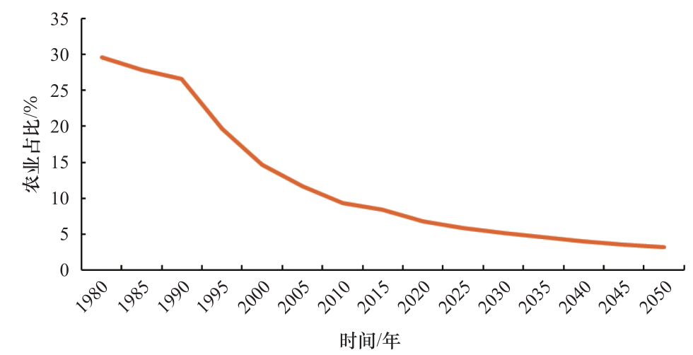 從世界經濟發展規律來看,隨著經濟的增長,一國農業勞動力總量及其在社會就業中的占比都將不斷下降。由于不同產業間的收入存在差異,農業在國民經濟總量中所占的比例會隨著經濟發展而逐漸縮小,農業部門從業人員也將逐漸向工業和服務業轉移。改革開放以來,我國農業勞動力總量及其占比也呈現了下降趨勢,但與發達國家不同,其下降幅度遠低于農業在經濟中的占比下降幅度(見圖 2、圖 3)。新時期,進一步提高農業勞動生產率、減少農業部門就業人口是我國成功實現農業農村轉型和現代化發展的必然選擇,農業 GDP 和勞動就業人口占比都將隨經濟結構轉型繼續下降,并逐步朝向趨同方向發展。