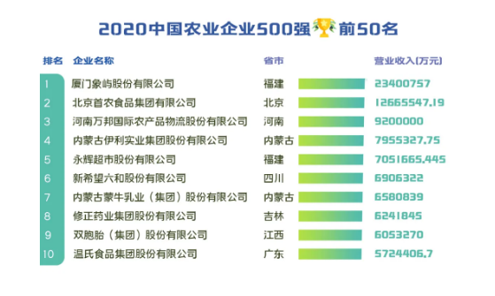 由農民日報社組織評定的2020中國農業企業500強發布,本次入圍門檻為5億元,入圍企業最多的省份為山東省,共151家企業上榜。本次農業企業評定主要參考營業收入和利潤,按照2018年企業營業收入進行排名,全國28個省(市..
